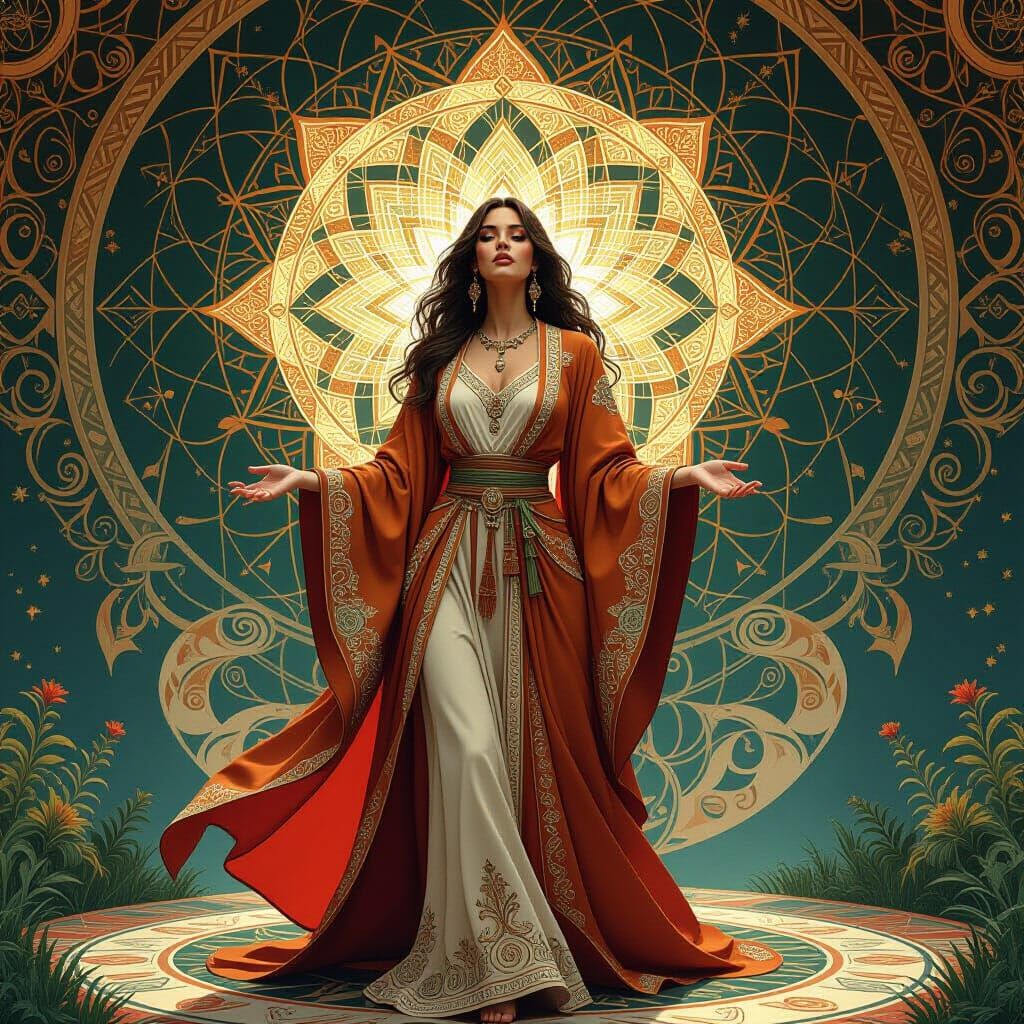 This image shows a mystical woman in an earth-toned robe. She stands amidst swirling sacred geometry, surrounded by symbolic motifs in a vintage kaleidoscope aesthetic.