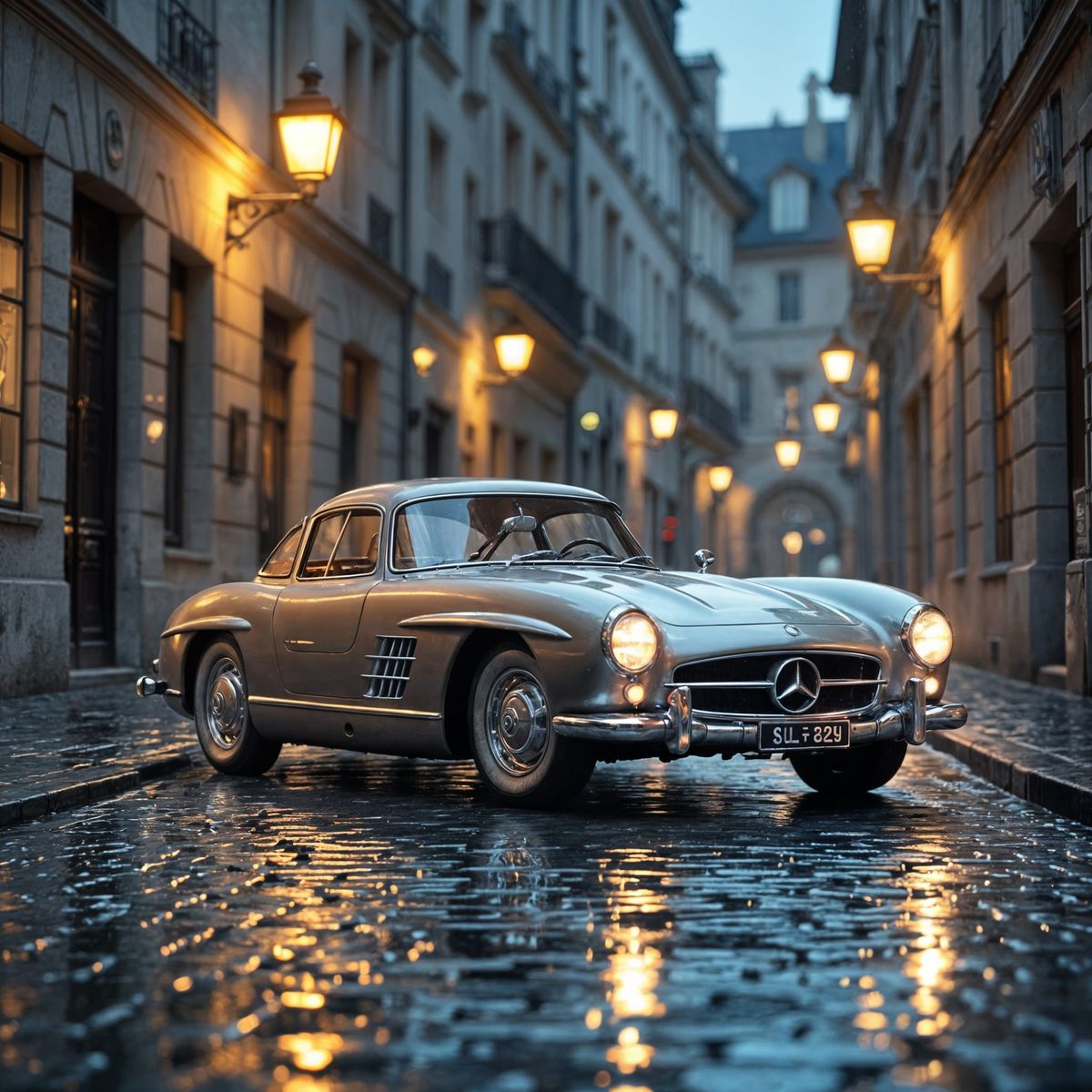 This image shows a classic Mercedes-Benz 300 SL Gullwing parked on a wet Parisian street at dusk. Dramatic lighting and reflections create a cinematic feel, like a film still.