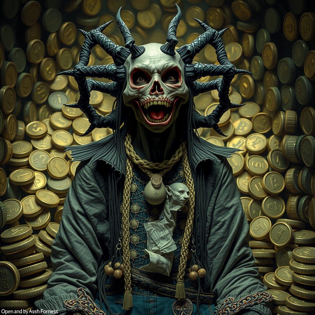 A haunting image of a figure overwhelmed by envy and greed, amidst a fortune of gold. The artwork evokes a dark, surreal aesthetic reminiscent of biomechanical horror art.