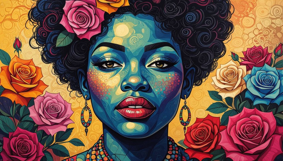 This image showcases a vibrant and intricate ink drawing with surreal and maximalist elements. The artwork features roses and celebrates melanin in a colorful and captivating style.