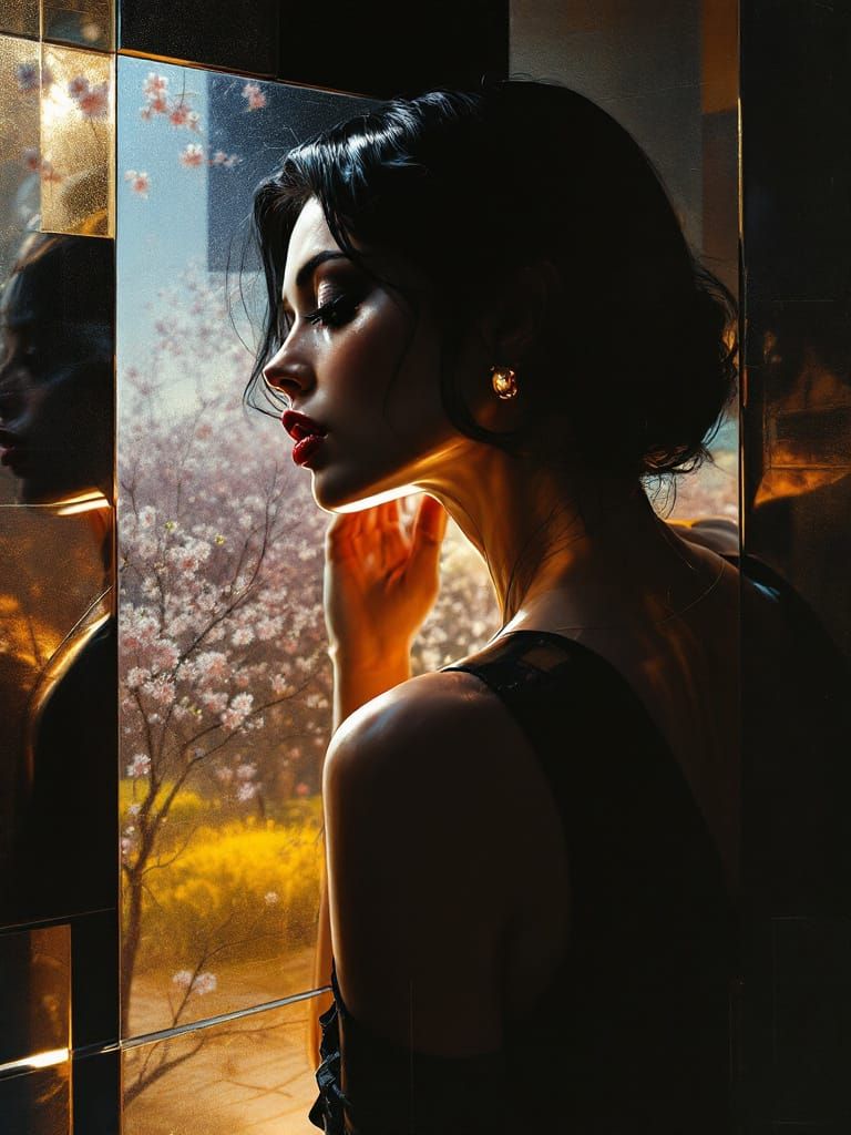 This image blends abstract geometric forms with a vintage pin-up style in a retro garden setting. It features dramatic light and shadow, metallic sheen, and deep contrasts, reminiscent of film noir and classical painting techniques.