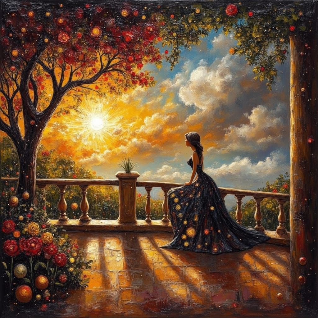 A vibrant painting of a woman on a balcony surrounded by greenery. The artwork blends surrealist and cubist elements with bold brushstrokes and vibrant colors, in the style of Italian modernism.