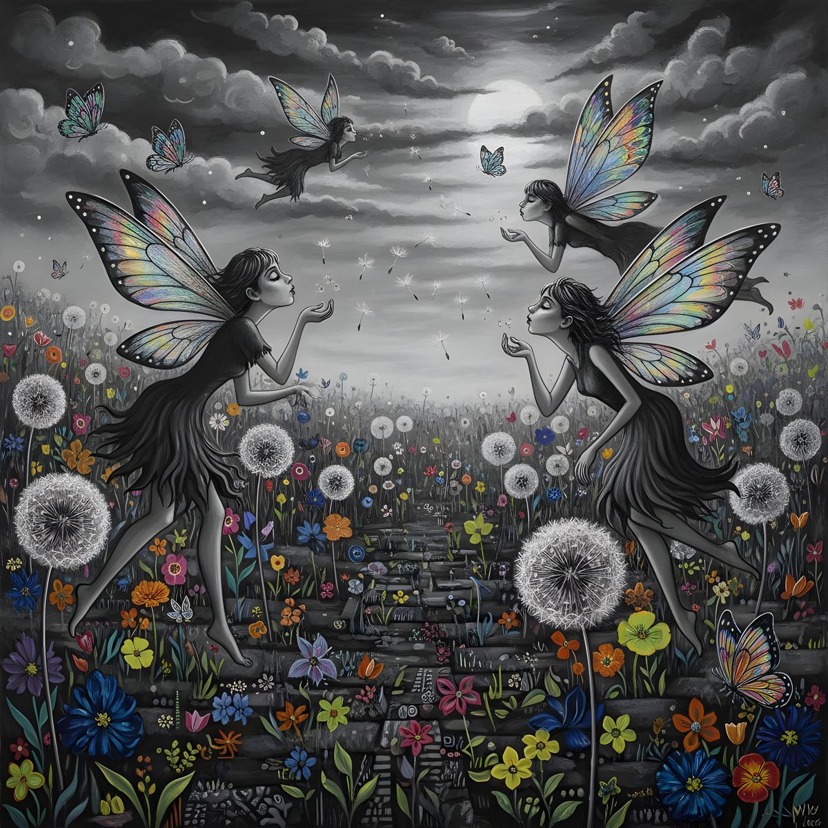 A dark meadow filled with winged fairies making wishes amidst a vibrant, dreamlike dandelion landscape, featuring abstract art with complementary colors and fine details.