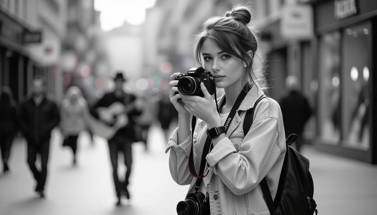 A black and white portrait of a young photographer on a busy city street. The image captures a sense of gritty realism and cinematic intimacy with high contrast.
