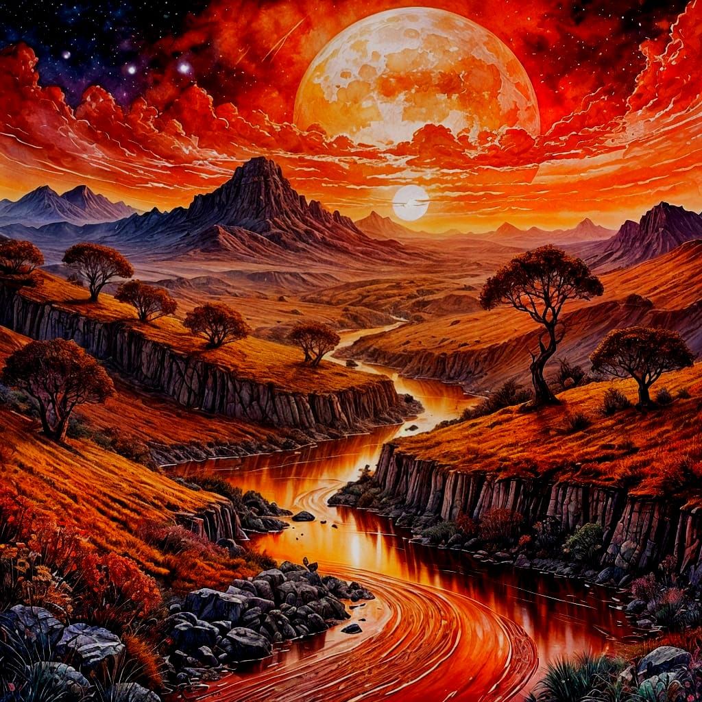 A striking picture of a colourful and chaotic blood moon landscape. The artwork employs swirling lines, golden hour lighting, and watercolour techniques to create a wonderland aesthetic.