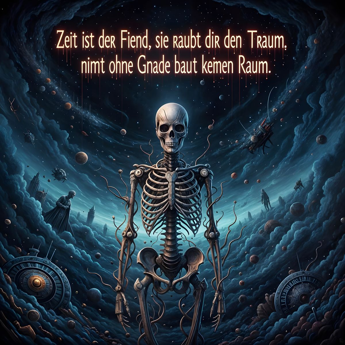"Above the words "Zeit ist der Feind, sie raubt dir den Traum, nimmt ohne Gnade, baut keinen Raum" appear in radiant calligraphy".