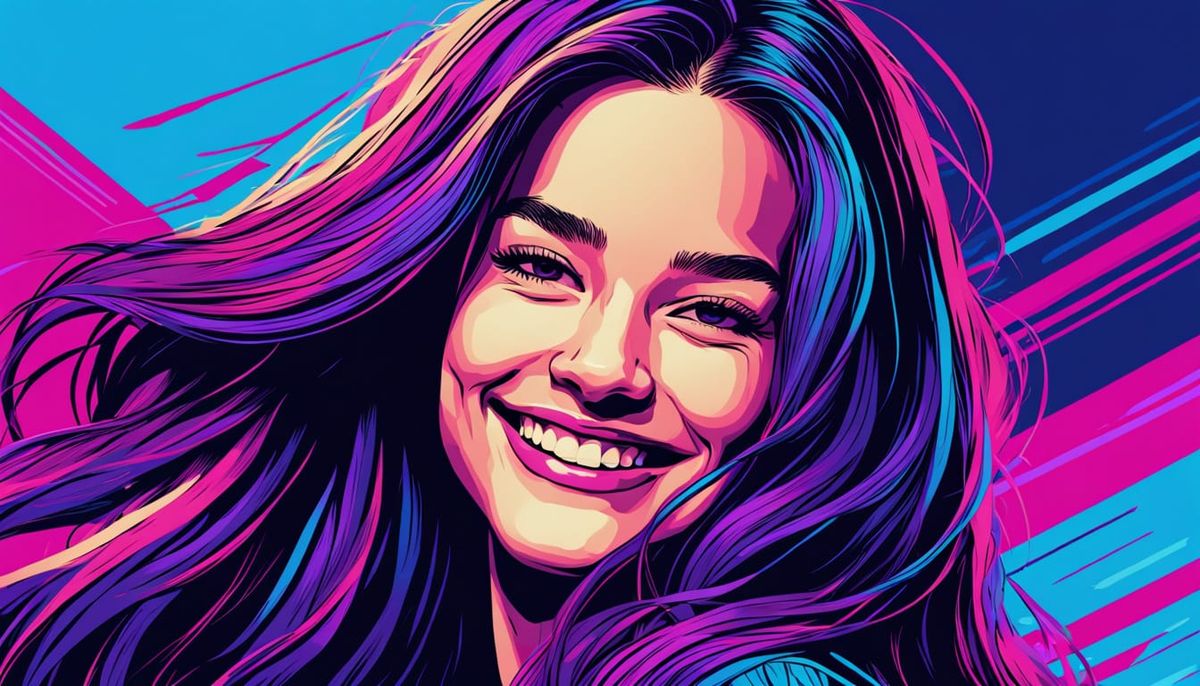 A vivid pop art style portrait of a smiling woman with long hair. The artwork features graphic lines, dynamic lighting, and bold pink, violet, and blue colors creating a fun, energetic vibe.