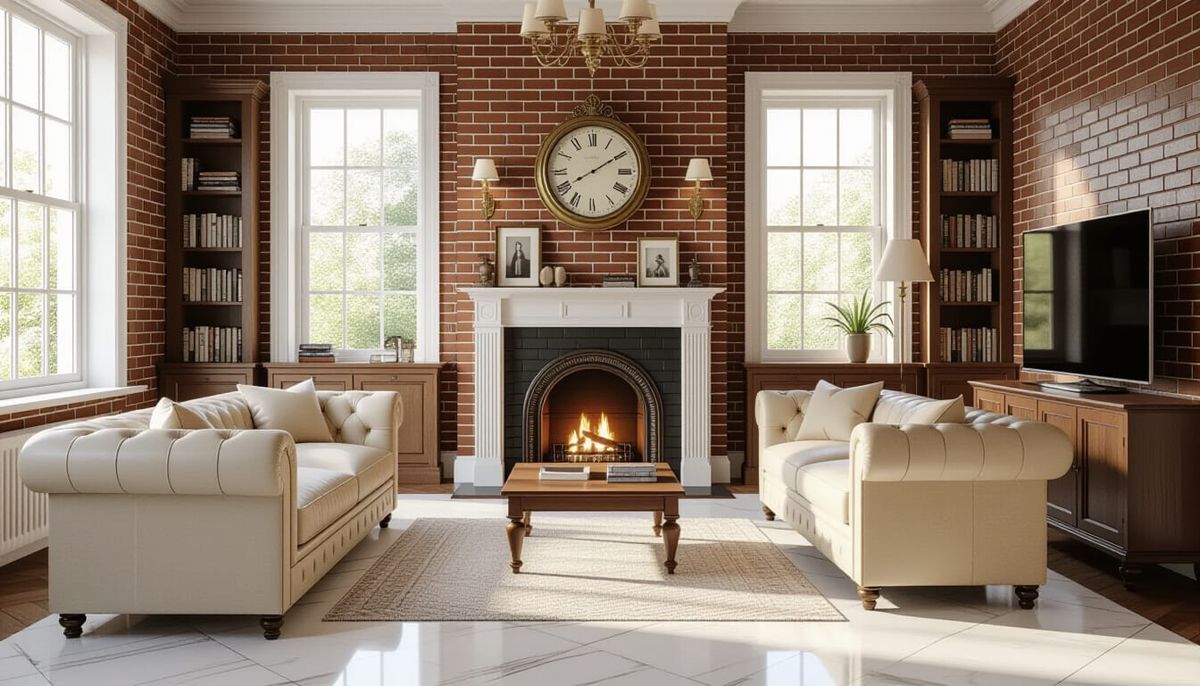 This image shows a photorealistic Victorian living room with an L-shaped sofa, fireplace, and brick wallpaper. Sunlight illuminates the space, highlighting vintage details and a marble floor.