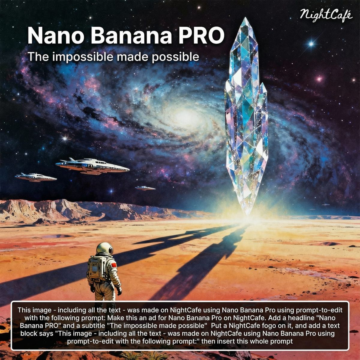 I don't understand the concept, since this image was made with Seedream 4.0 - Just to show that Nano Banana Pro can write? ๐คจ๐ค"Make this an ad for Nano Banana Pro on NightCafe. Add a headline "Nano Banana PRO" and a subtitle "The impossible made possible". Put a NightCafe logo on it, and add a text block that says "This image - including all the text - was made on NightCafe using Nano Banana Pro using prompt-to-edit with the following prompt:" then insert this whole prompt."
