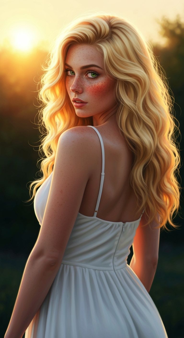 This romantic oil painting captures a young woman with blonde wavy hair and freckles, backlit by the golden hour sun. She gazes provocatively over her shoulder, her white sundress creating a soft silhouette.