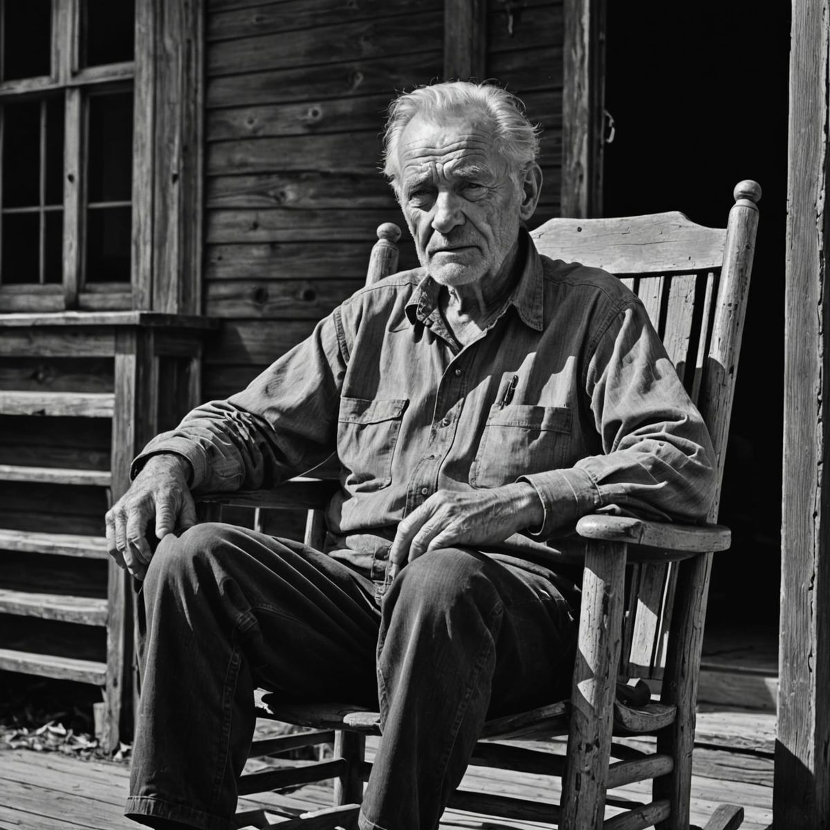 A hyperrealistic black and white photograph of an elderly man with a wrinkled face relaxing on a weathered porch in a rocking chair. The image showcases dramatic side lighting and intricate detail.