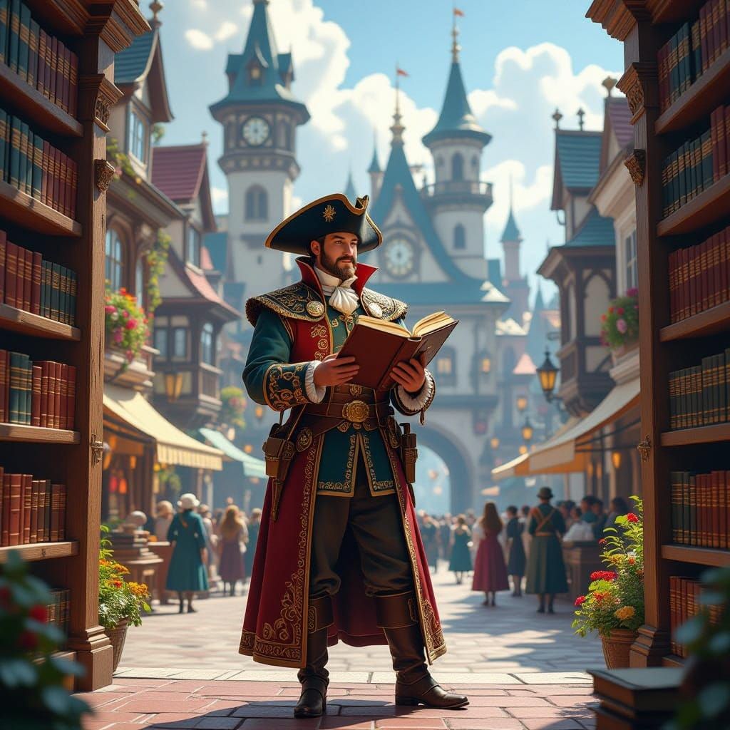 A charming town guard stands amidst a vibrant town square filled with towering bookshelves and colorful leather-bound books, entertaining a crowd with a captivating story, set against the stunning backdrop of Bookville, a place where fantasy and reality blend in a world of intricate architecture and ench...
