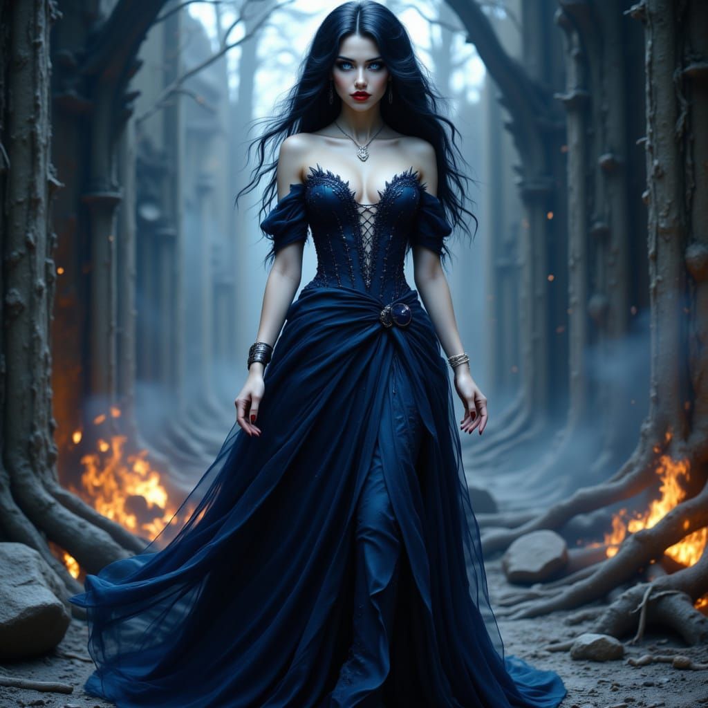 This image shows a captivating woman with porcelain skin and raven hair in a midnight blue gown. Her allure and danger are enhanced by dramatic lighting and cinematic atmosphere, rendered with intricate details.