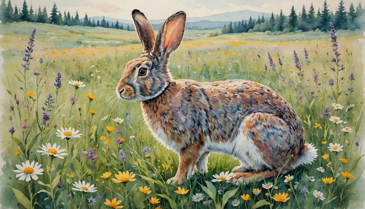 This image features a detailed rabbit outline superimposed with a vibrant wildflower meadow, rendered in soft pastel watercolor tones with gentle impressionist strokes.