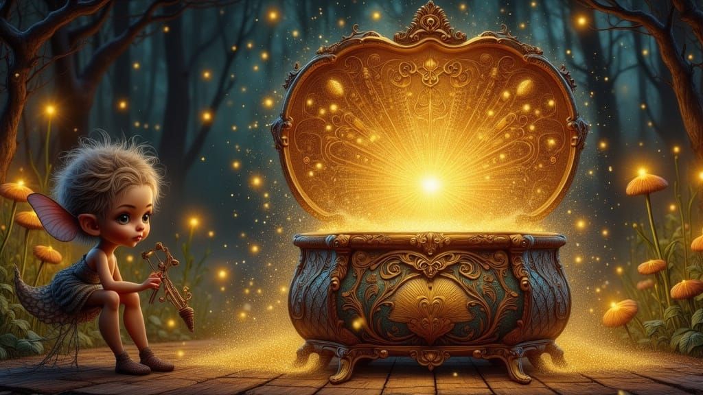 This image shows an ornate vintage music box opening to release iridescent fairy dust, with a goblin playing a flute on the edge, in a whimsical, dreamy style.