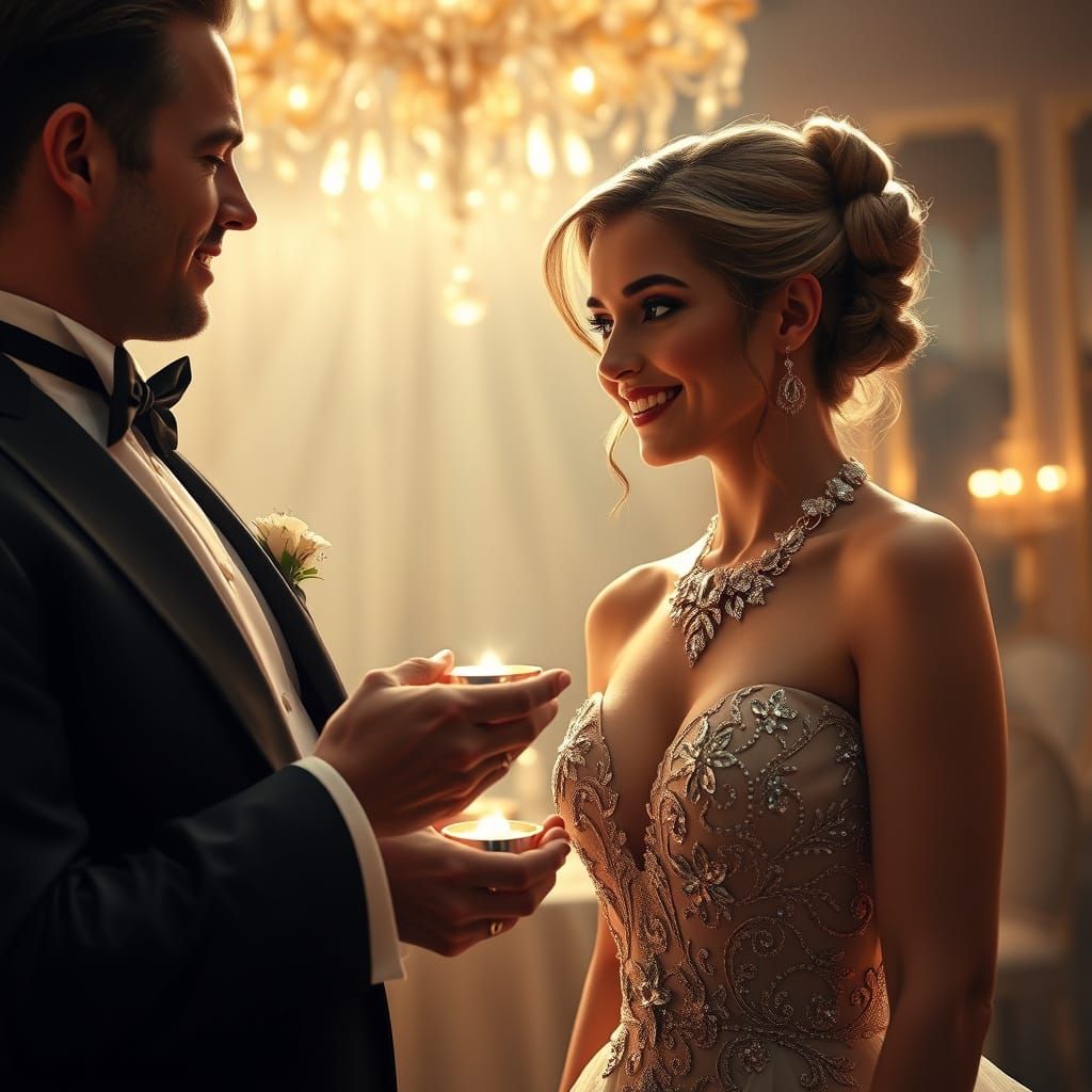 This image captures a refined gentleman surprising his elegant lady with a dazzling diamond necklace in an opulent ballroom setting, evoking a sense of luxury and romance.