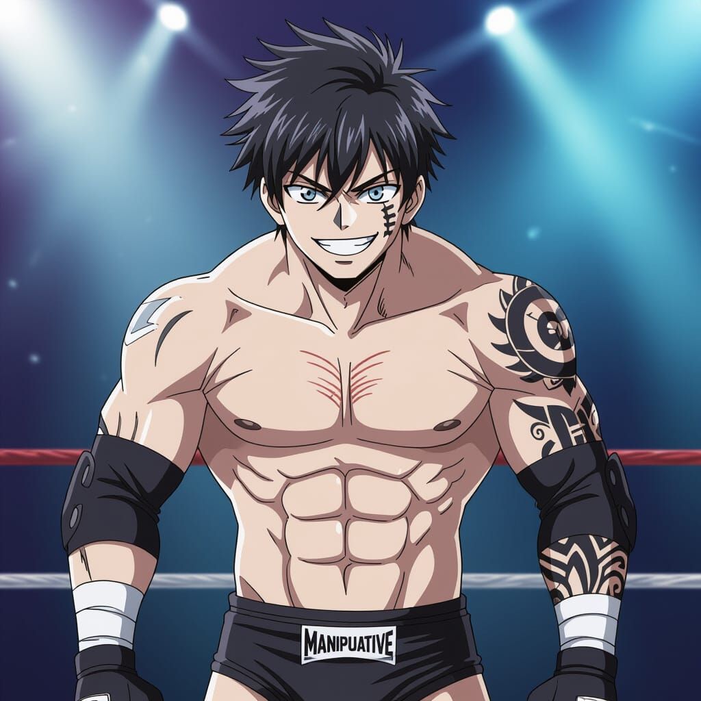 This image features a young male anime wrestler with striking features, including a tattoo sleeve and a mischievous grin. The scene uses high-contrast lighting and vibrant colors, rendered in a dynamic anime style with bold linework and cel-shading.