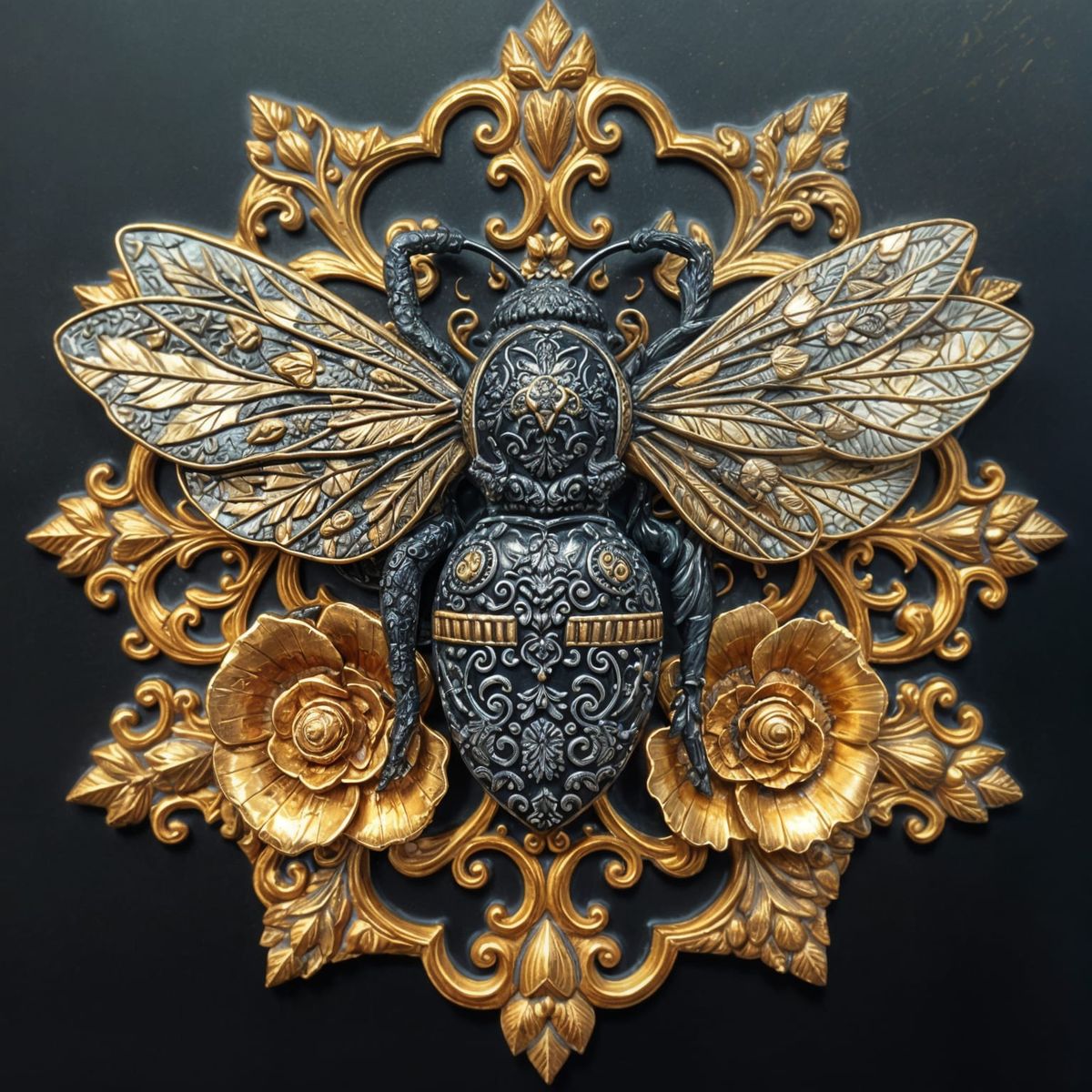 A stunning digital sculpture of a honey bee in intricate bas relief, set against a lush nature background with dripping honey and fine filigree details.