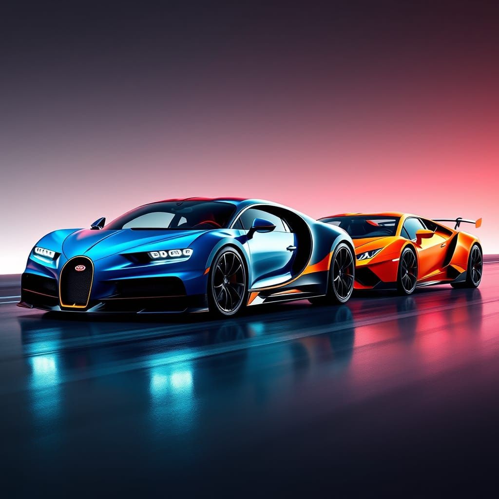 This image depicts a photorealistic fusion of a Bugatti Chiron and a Lamborghini Huracan, set amidst sleek racing lines and vibrant colors, evoking a futuristic aesthetic reminiscent of cyberpunk and sci-fi art.