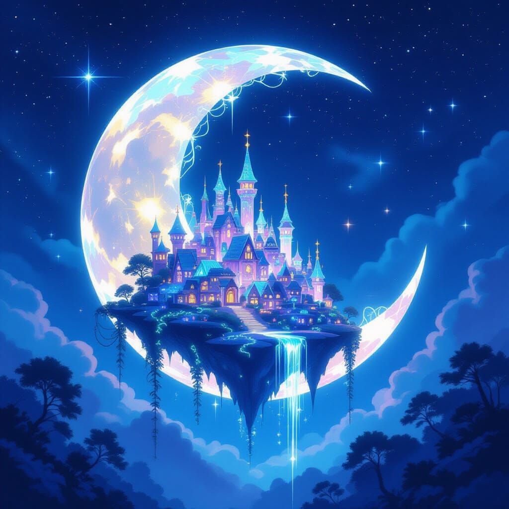 A luminous crystal moon hosts a glowing village, with shimmering vines cascading down. This fantasy digital painting features vibrant colors and dramatic lighting.