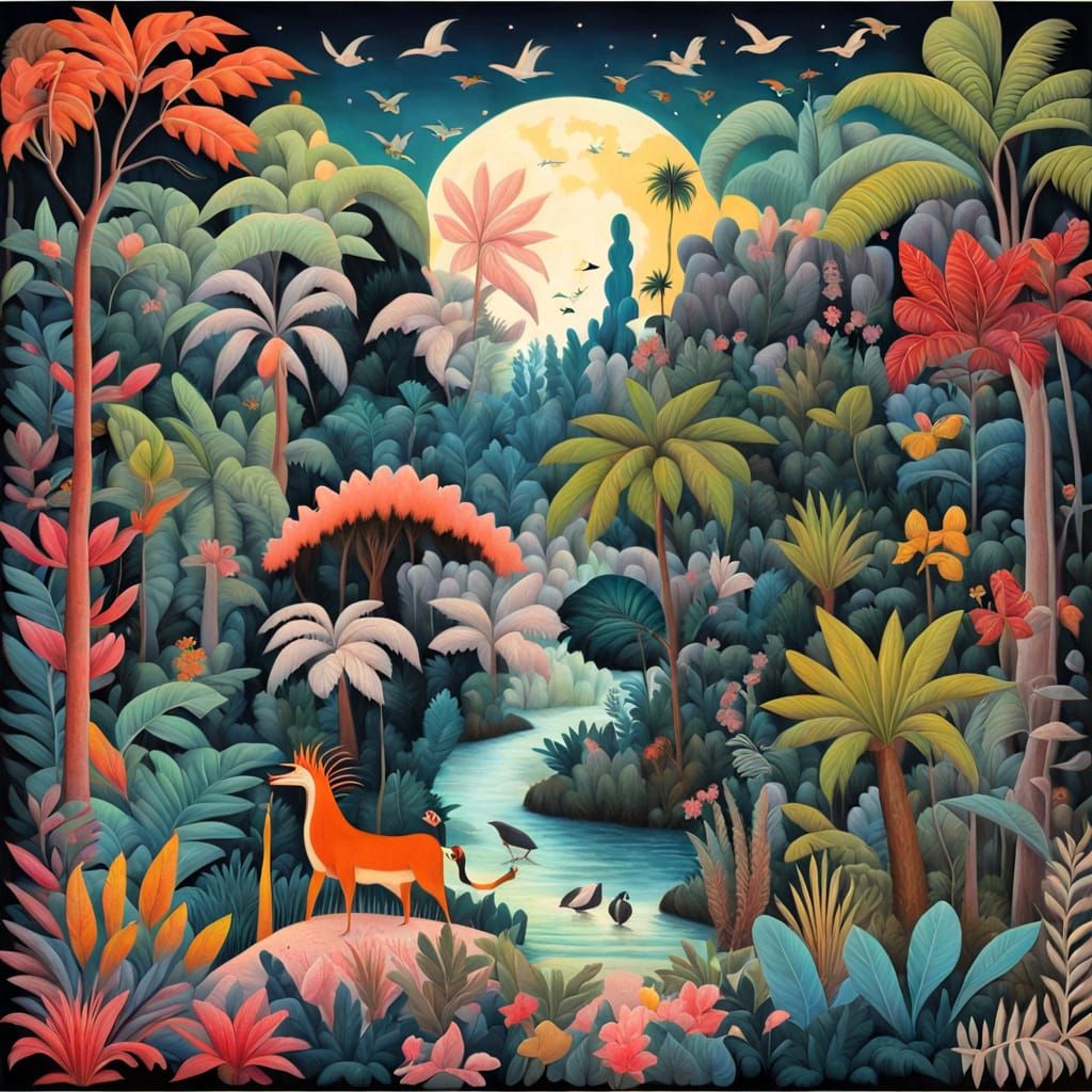 This image shows a vibrant and dreamlike jungle landscape under a full moon. The fantastical scene features naive art elements and creatures rendered with rich colors.