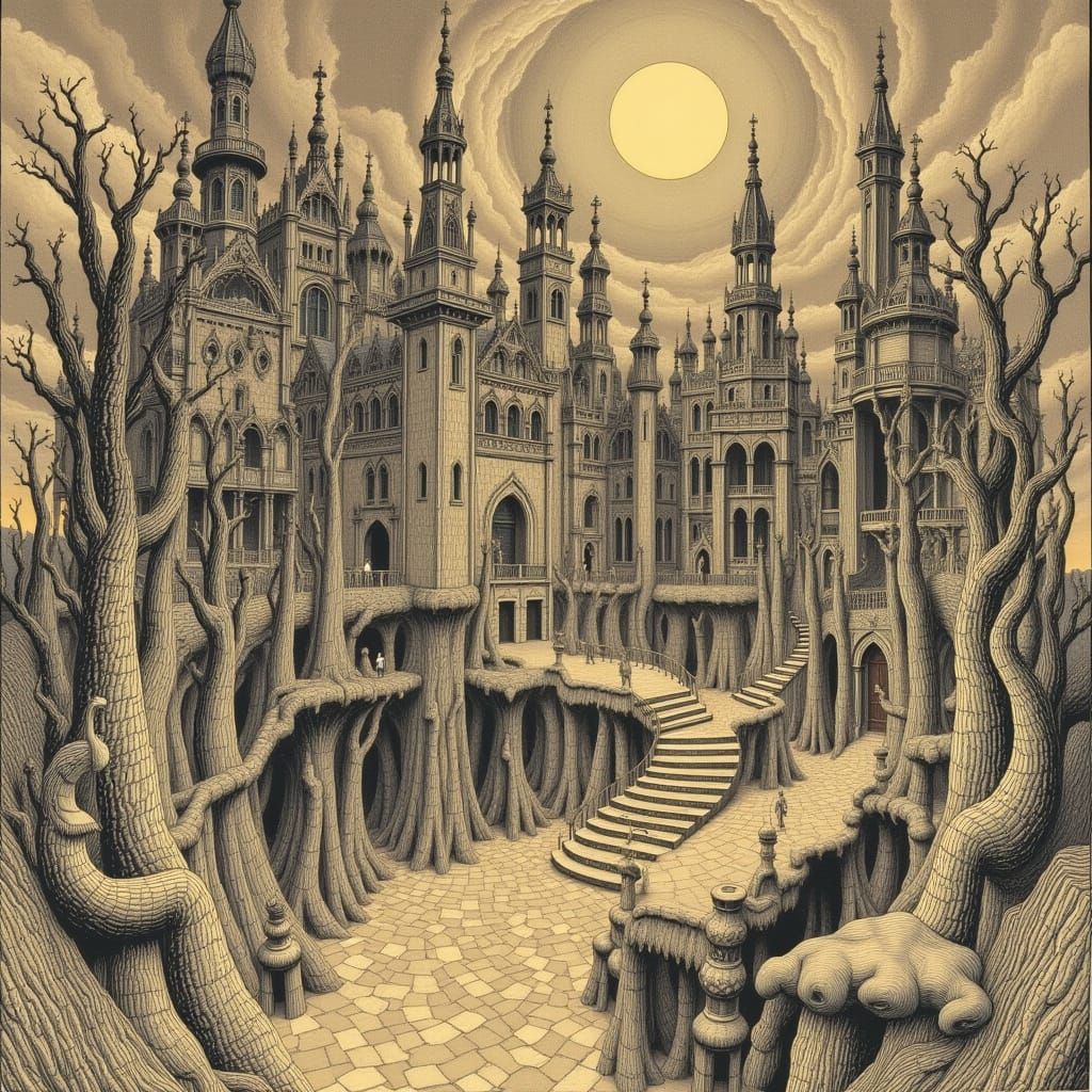 Generate unique images in the style of Edgar Allan Poe and M.C. Escher with our free AI tool. Easy and fun!