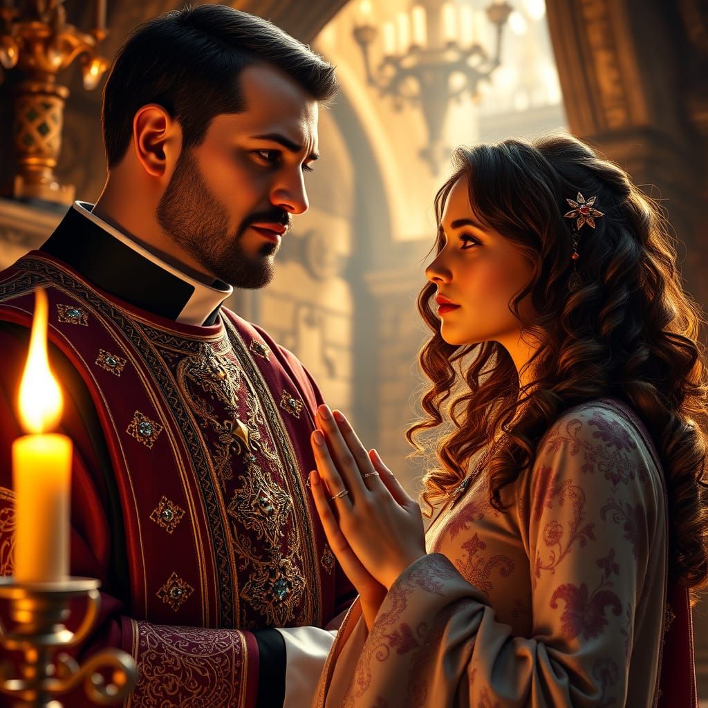 This image shows a majestic archbishop and a young woman in a lavish castle setting, surrounded by warm candlelight and the glow of a crackling fire. The artwork is a detailed matte painting with deep colors and intricate detail, showcasing a fantastical and romantic atmosphere.