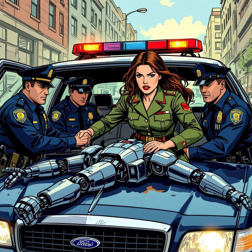 Dynamic comic-style illustration depicting a dramatic arrest. A woman in a WWI-era uniform and a humanoid robot are taken into custody by officers in an urban setting.