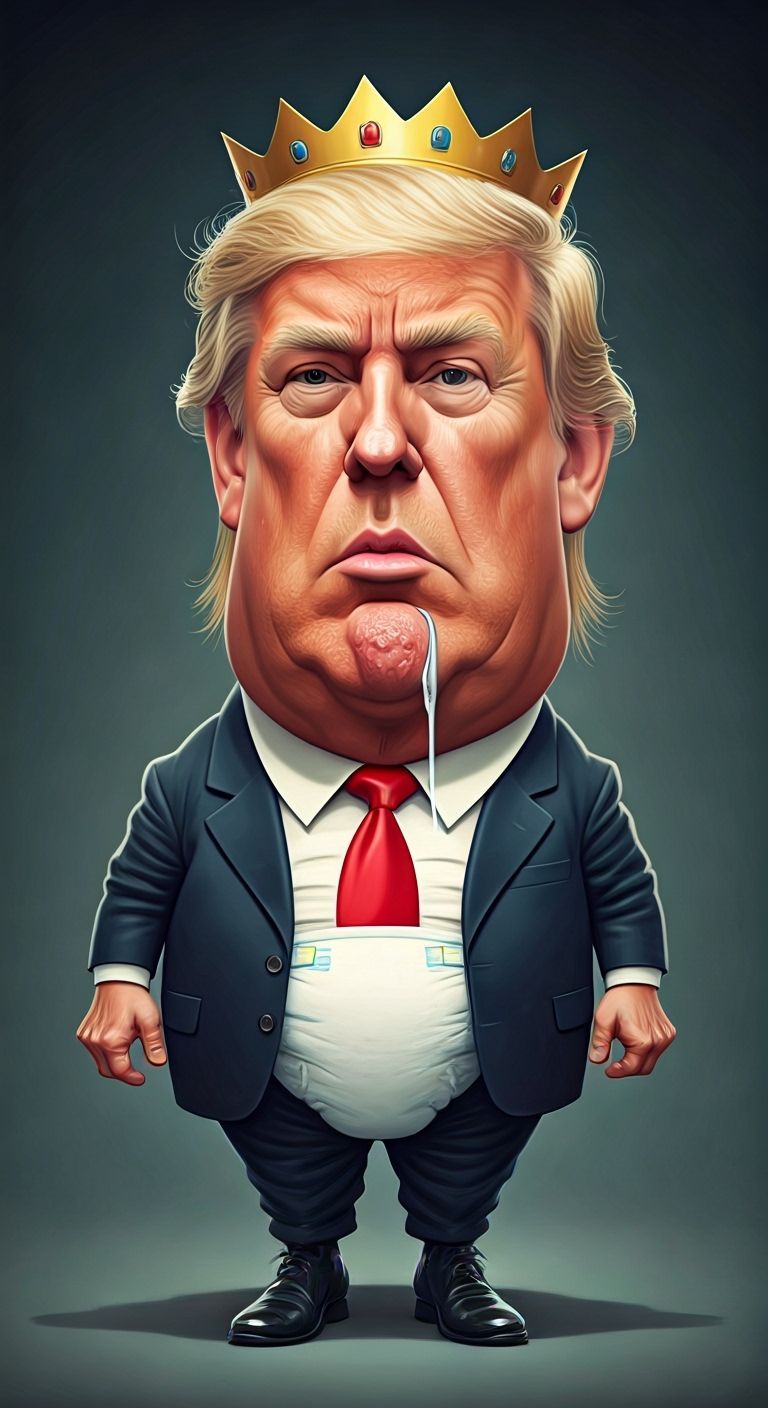 This image is a political cartoon featuring an unflattering caricature of Donald Trump depicted as an aspiring king, with exaggerated features, wearing a diaper and drooling.
