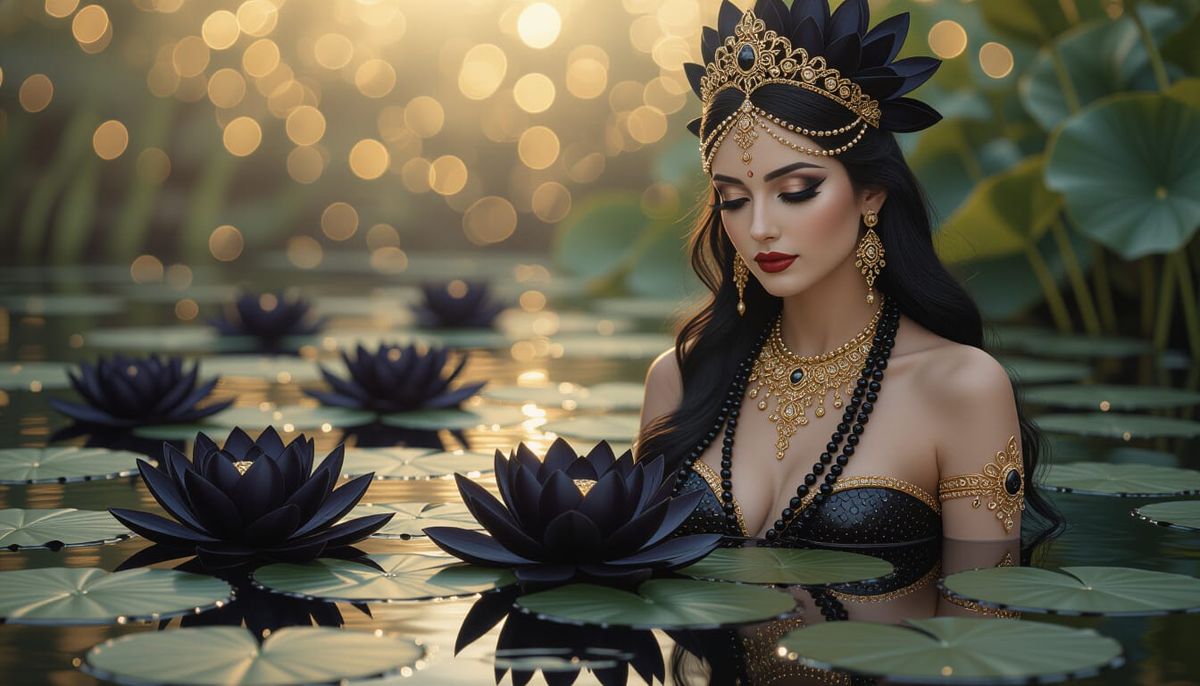 This image shows an ethereal goddess adorned with black pearls and gold jewelry, standing in a glistening pond filled with black lotus and lily pads. Gold sparkles create a magical bokeh effect in the background.
