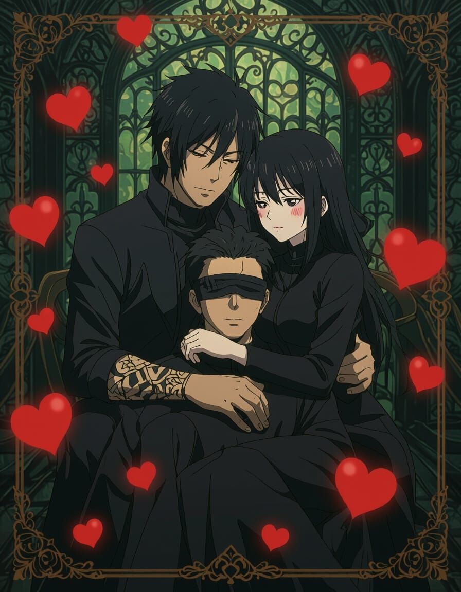 This image shows a tattooed man sitting with a blindfolded woman in black clothes on his lap, surrounded by floating red hearts. The couple are depicted in an intricate Victorian-style anime aesthetic.