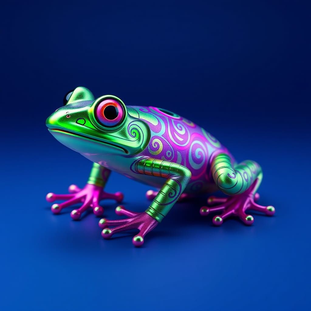 A hyper-realistic 3D frog fishing lure rendered against a gradient blue backdrop. The image features swirling patterns of iridescent green and purple in a futuristic, dreamlike digital art style.