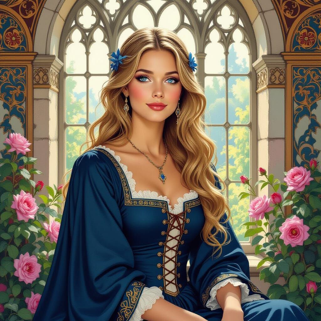 This image shows a fair-haired woman in medieval dress relaxing in a rose garden. The artwork features gothic architectural elements and soft pastel colors in an art nouveau style.