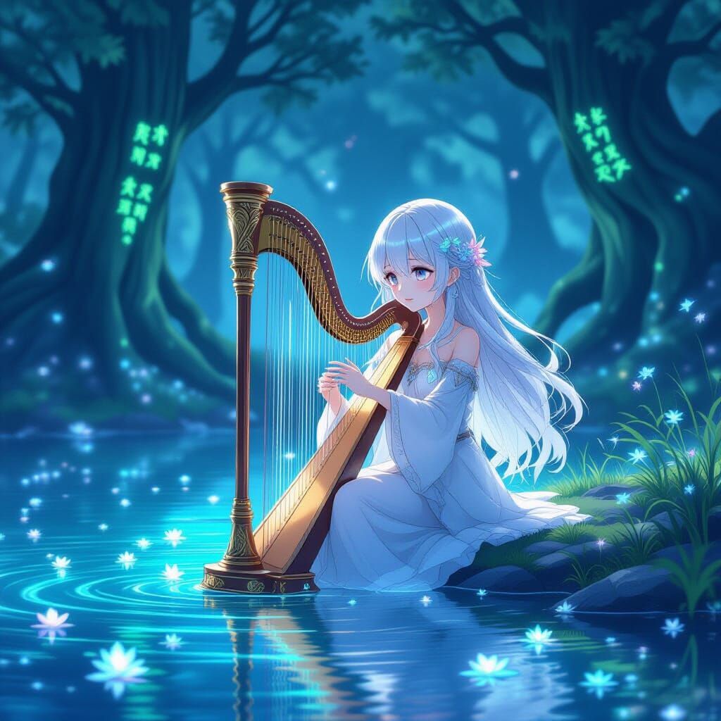 This image shows an anime girl playing a harp by a lake with glowing flowers. Ancient trees with glowing runes stand guard in the background, in a painterly anime style.