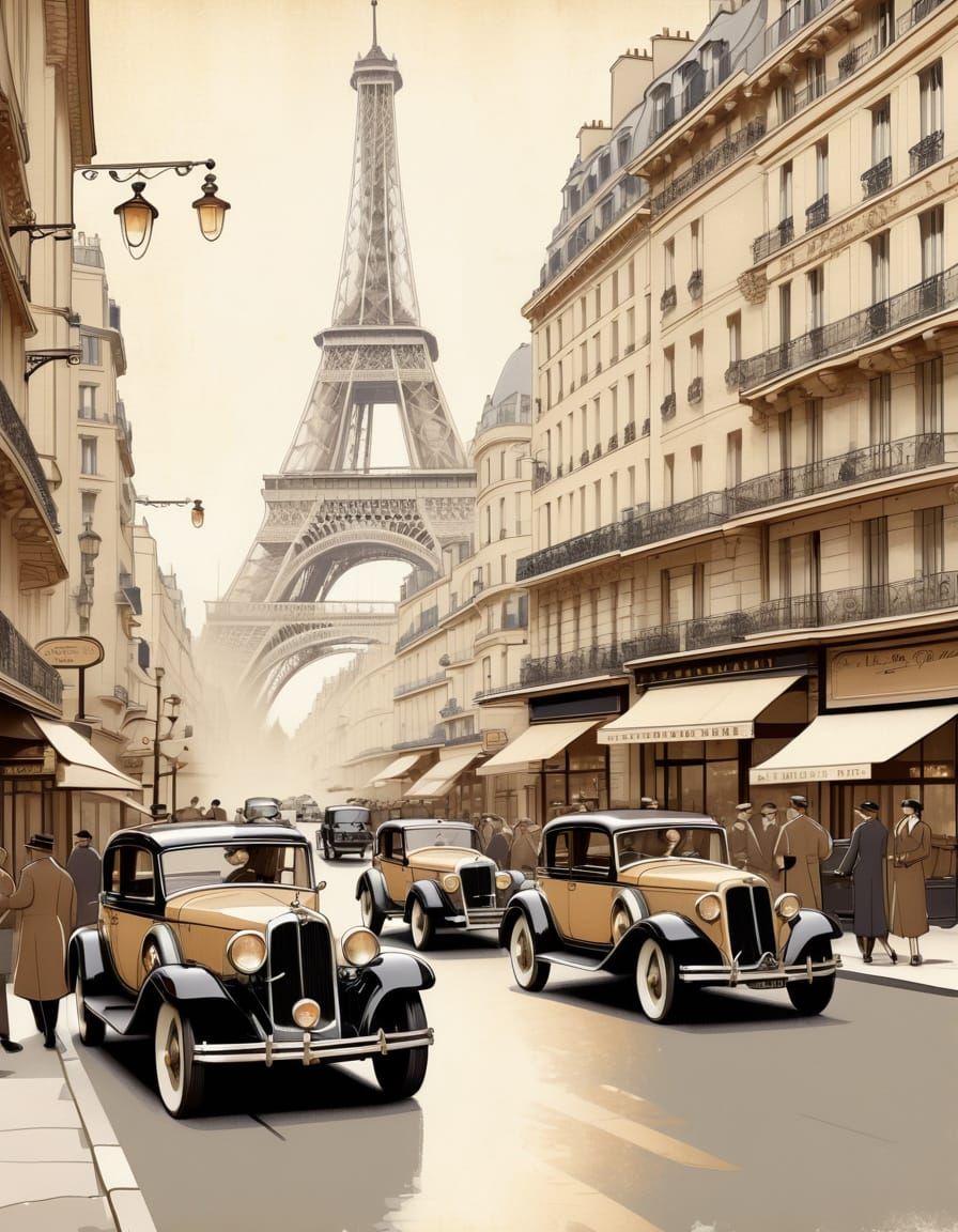 Generate your own unique 1930s Parisian street scenes with vintage cars. Free and easy AI image creation.