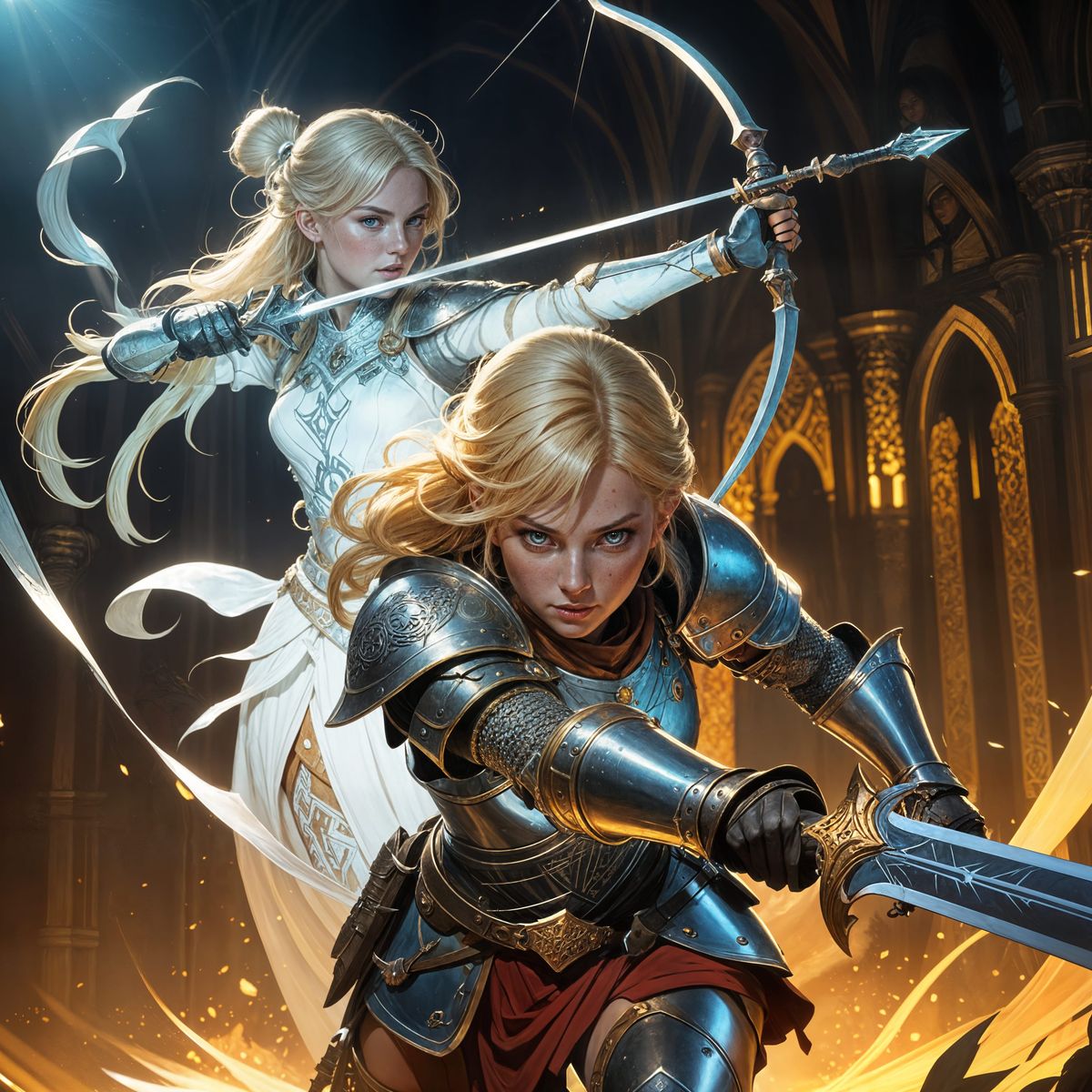 A dynamic portrait of a young female fighter in chainmail armor, wielding a great sword and accompanied by her ghostly shadow, showcasing the fusion of dark fantasy and vibrant colors in a stunning 8k resolution artwork.