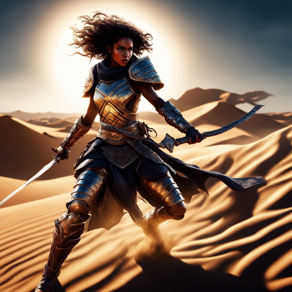 A dynamic desert warrior leaps forward, bladed whip at the ready, amidst swirling sand, in a vibrant and detailed digital art style reminiscent of high-contrast, cinematic action scenes.
