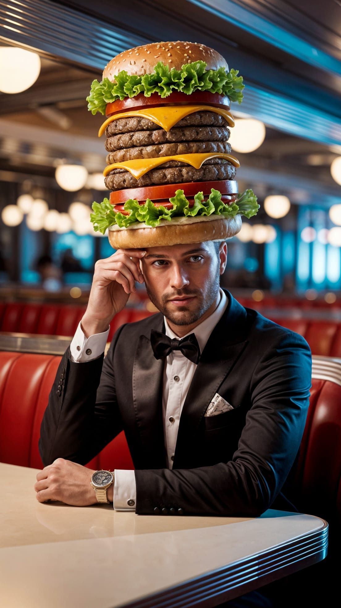 This image shows a stylish man wearing an avant-garde hat made of hamburger ingredients in a vintage diner. The photograph features warm lighting and a shallow depth of field, highlighting the playful design.