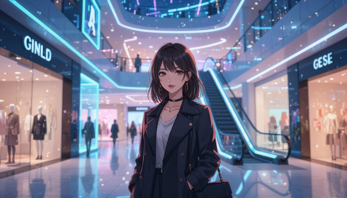 This image shows a stylish woman in an anime-inspired shopping center. Bright neon lights and modern architecture create a vibrant scene, reminiscent of a high-end fashion district.