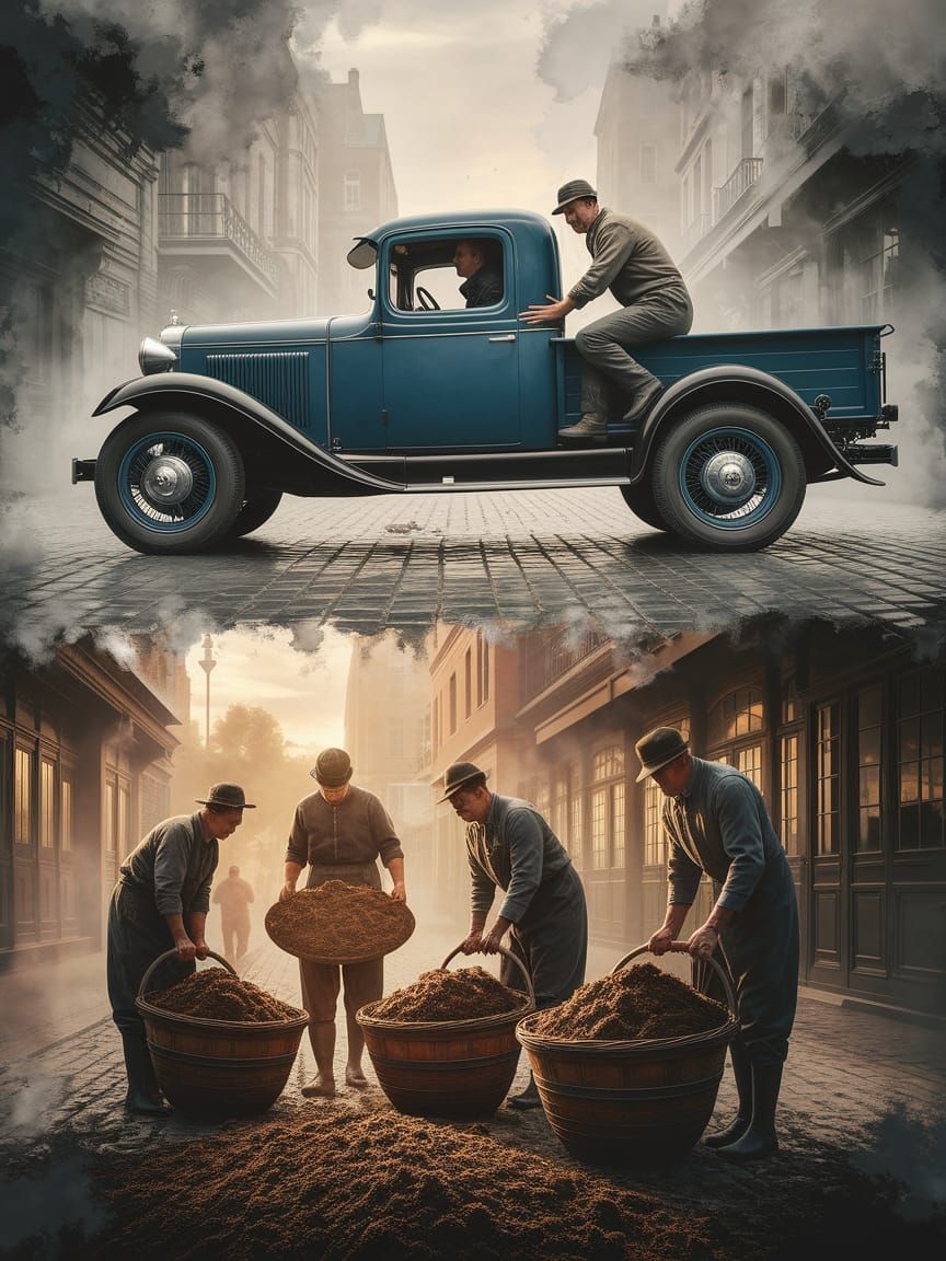 This image captures a 1930s market square at dawn, featuring a vintage truck with two passengers and janitors collecting horse manure. Rendered with a watercolor sfumato effect, it evokes Flemish painting techniques.