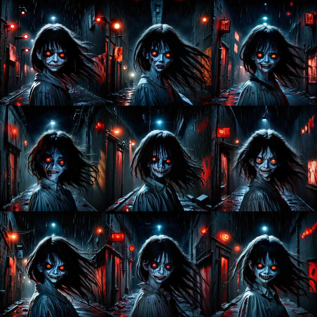 This image depicts a terrifying girlfriend figure in a blood-soaked dress, lurking in a dark alley with glowing eyes. The scene is rendered with dramatic lighting and a horror aesthetic.