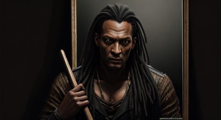 Photorealistic high 64K resolution. Deep saturation, high contrast, ultradetailed. Dynamic angle. (Pitch black:1.3) at night. 30-year-old (Tony Todd as Candyman with metal hook hand lurking in the reflection of dark bedroom mirror:1.3). Textures of skin, clothes and hair richly detailed. Moody shadows ...