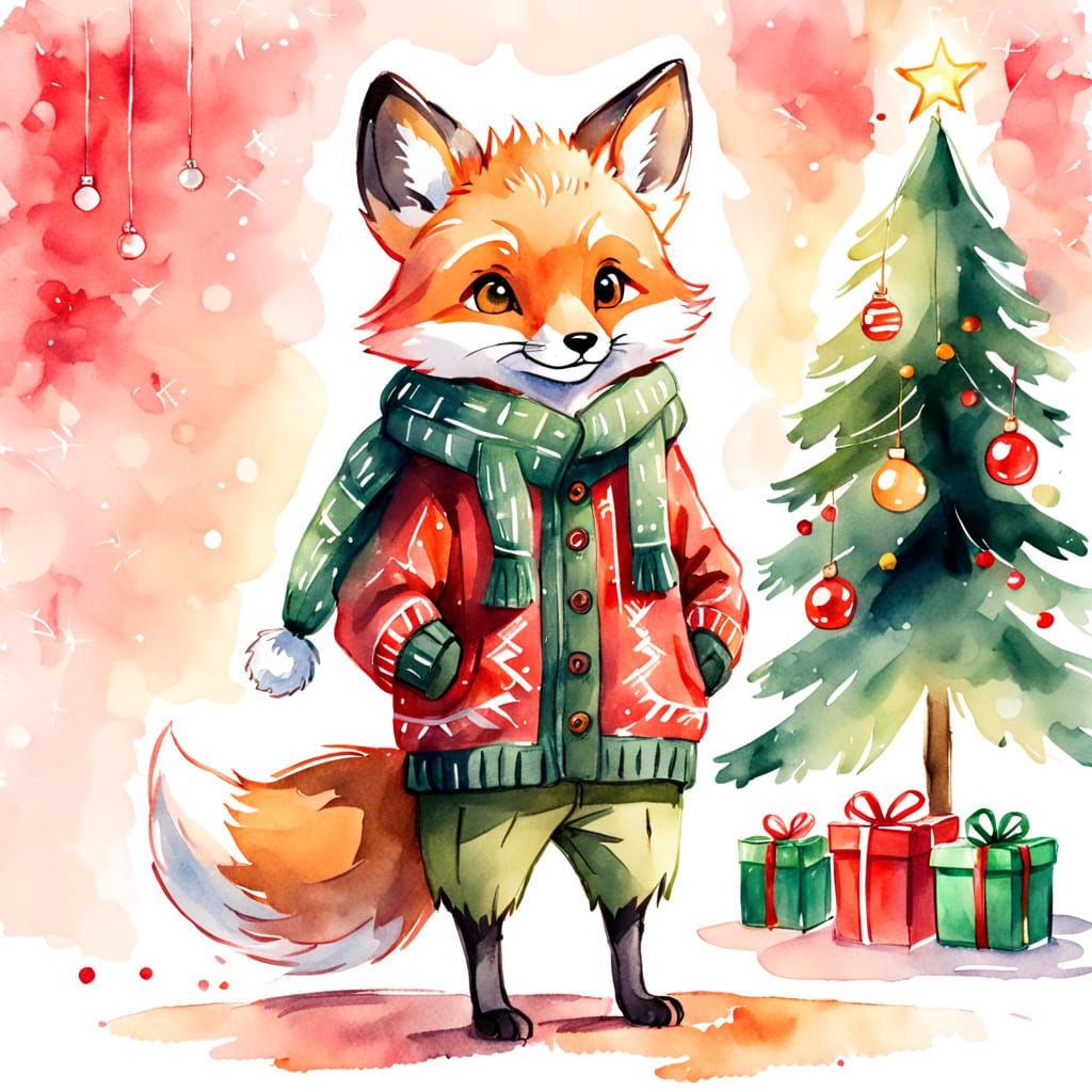 This image shows a cute fox cub standing on two legs, dressed for Christmas in a charming watercolor sketch style. Features expressive brushstrokes and festive red and green colors.