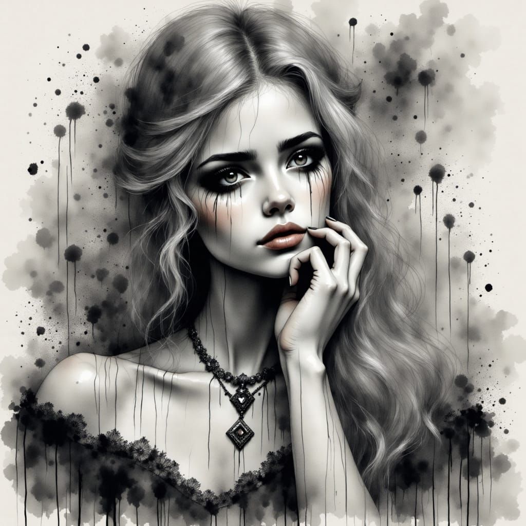 This striking portrait shows a Norse goddess with flaxen hair and a diamond pendant, lost in thought with a contemplative gesture, surrounded by elegant, ethereal dress and subtle ink splatters in a bold, expressive style