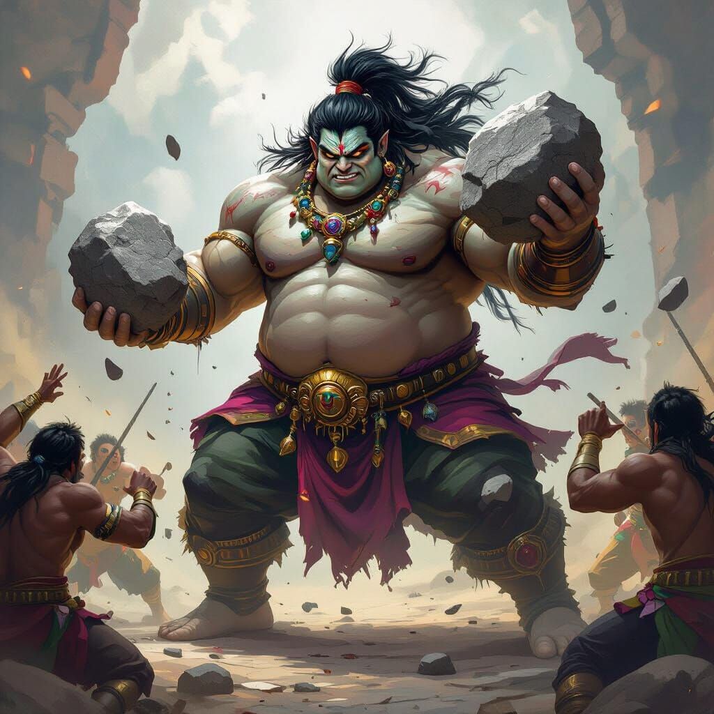 This image shows a powerful, rotund Asura warrior with black hair, fighting with a large rock. Rendered in a dramatic, high-contrast digital painting style with vibrant colors.