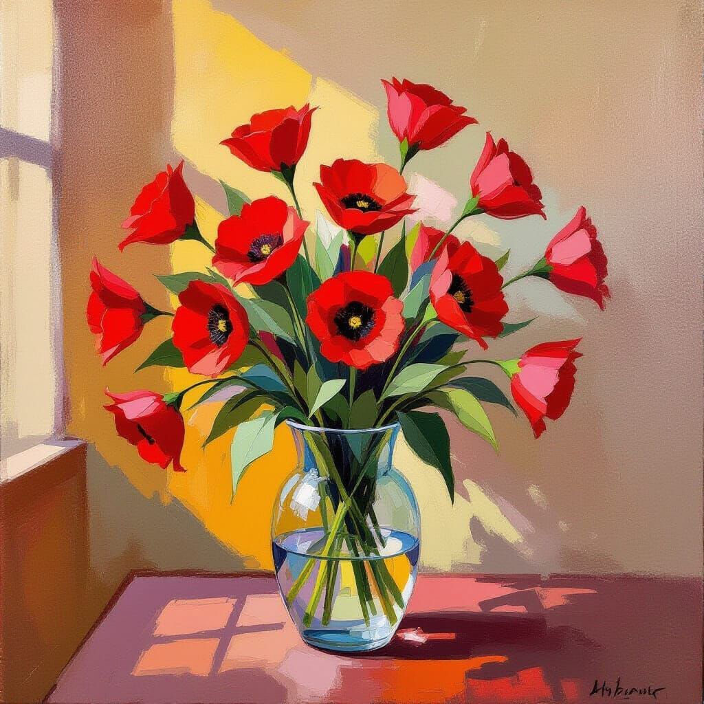 This oil painting captures vibrant red flowers in a vase within a cozy room. The artwork features expressive brushstrokes, a bold color palette, and fine details.