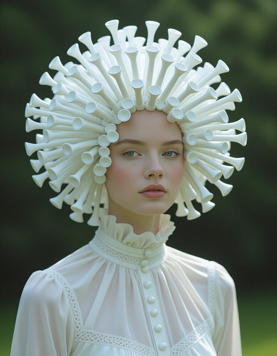 mirrors on nature mock her embodied ivory-white hair like scaffolding holds a series of recursive wild mirrors climbing up and around her bunched hair-strands in layered hollowness reflecting the futility of right now pull back into a wide angle wild angle full-length long shot mirroring superfluous ...