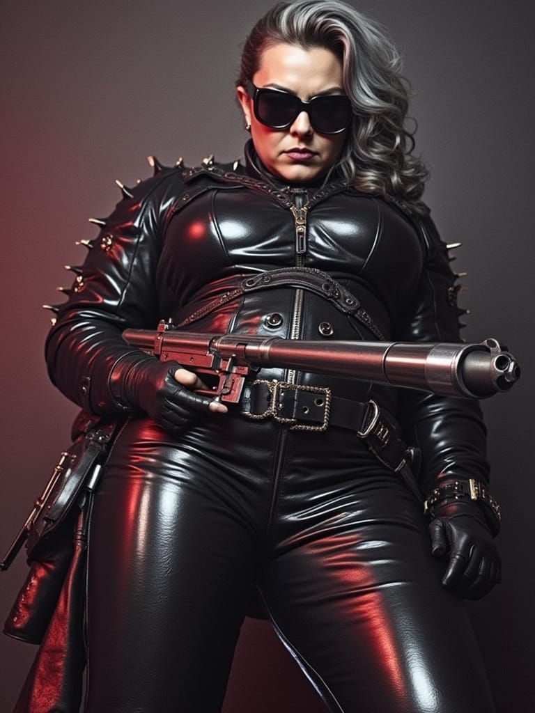 This image shows a powerful, imposing woman in a dark cyberpunk-inspired leathersuit, wielding a gun and exuding a sense of authority in a gritty, high-tech prison environment.