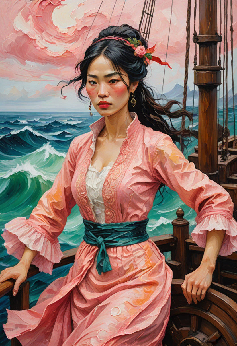 Impasto painting. Full-figure of A beauty Korean woman stands on a ship, misty pirates of carabean, wearing a vibrant pink peach tube dress