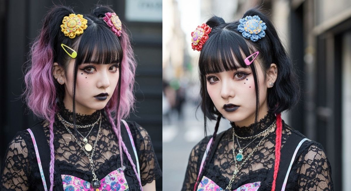 A portrait of a gyaru girl in Ura-Harajuku with colorful hair clips and an eclectic outfit. The image blends dark romanticism and intricate lace in a vibrant street style.